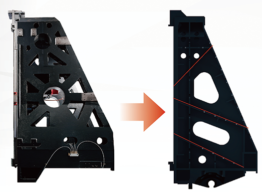 1. 一體式立柱加大跨距設計,寬度提升25%,剛性提升達15%;高剛性T型底座確保底座不變形及吸震能力強,線軌跨距高達 580mm。